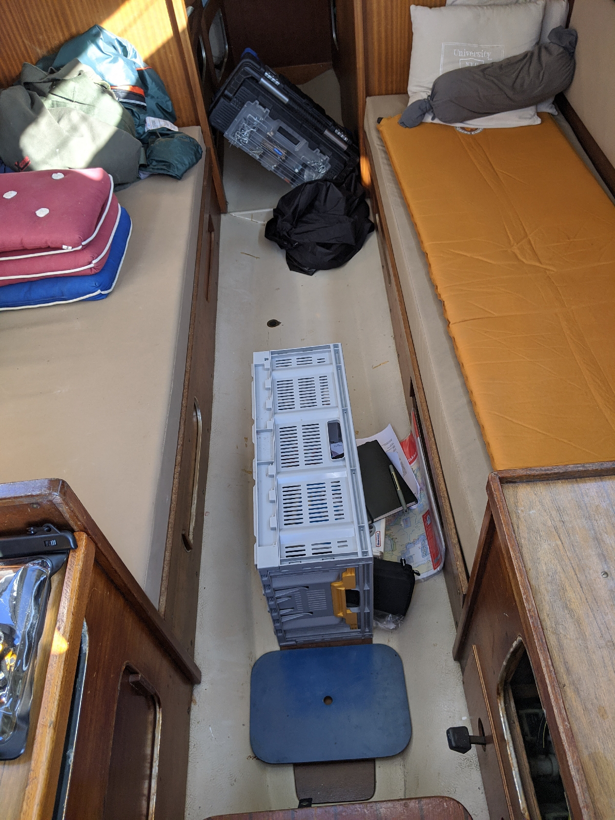 On July 31st, I've went shopping for a 10kg Rocna anchor, 50m of 6mm chain and 40m of 12mm lead anchor line, to improve on the existing 2 folding grapnel anchors with around 7m of rode each. One of the grapnel anchors also has 2-3m of 8/10mm heavy chain. I've tried to store the whole setup in the aft cocking locker, but the anchor is simply HUGE, so I'll have to improve on that. The initial idea was to launch the anchor aft and then drag it to the front - but more on that later.